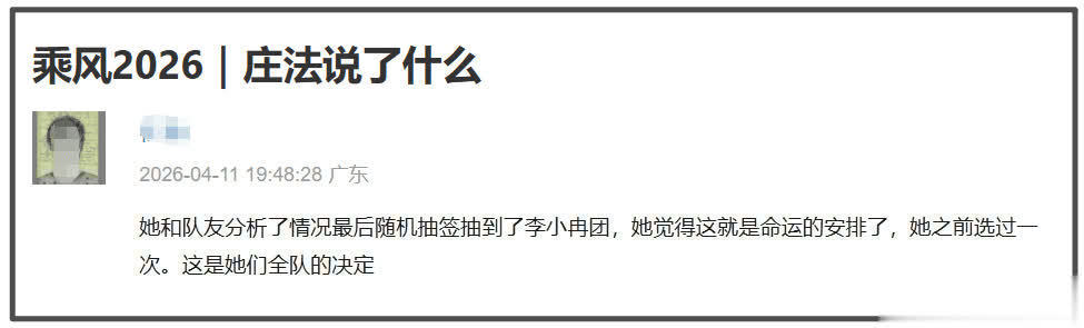 作为危险团,庄法团优先选择对手,她选了李小冉团进行比拼。庄法也给出了自己的理由,在和队友分析了情况后随机抽签抽到了李小冉团,她觉得这就是命运的安排。